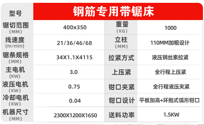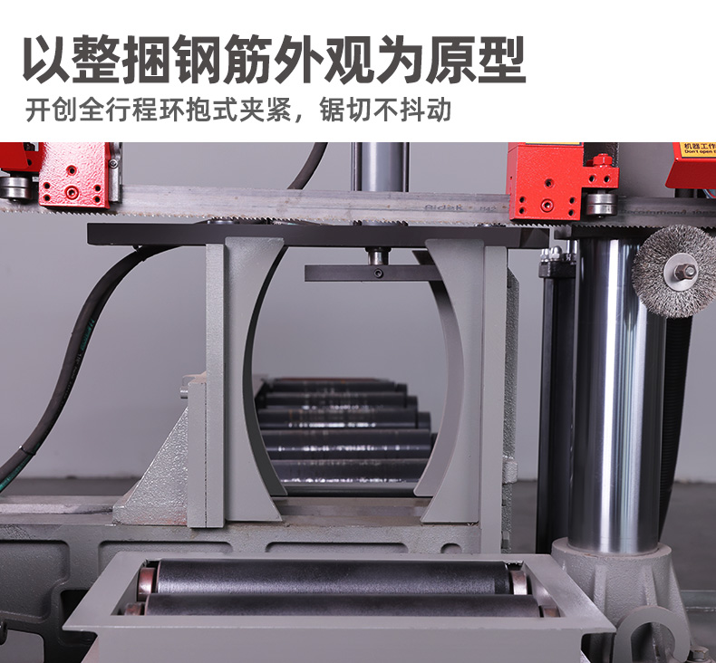 鋼筋專用帶鋸床(chuáng)是(shì)為了工地建築和鋼材市場設計一的地款專用鋸床,該鋸床可成(chéng)捆鋸切(qiē),鋼絲(sī)繩(shéng)自動打捆,加上兩邊半圓型夾鉗,再配上全行程下壓裝置,可一次性(xìng)切割直徑300左右的成捆鋼筋,該鋸床切割效率快,切口平整,是一款您必不可少的切(qiē)割神器。